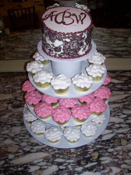 The French Toile design from the wedding invitations is duplicated and applied to the sides of the small topper cake that the couple will cut slices from. Three different flavors of cupcakes are tiered below on the stand.