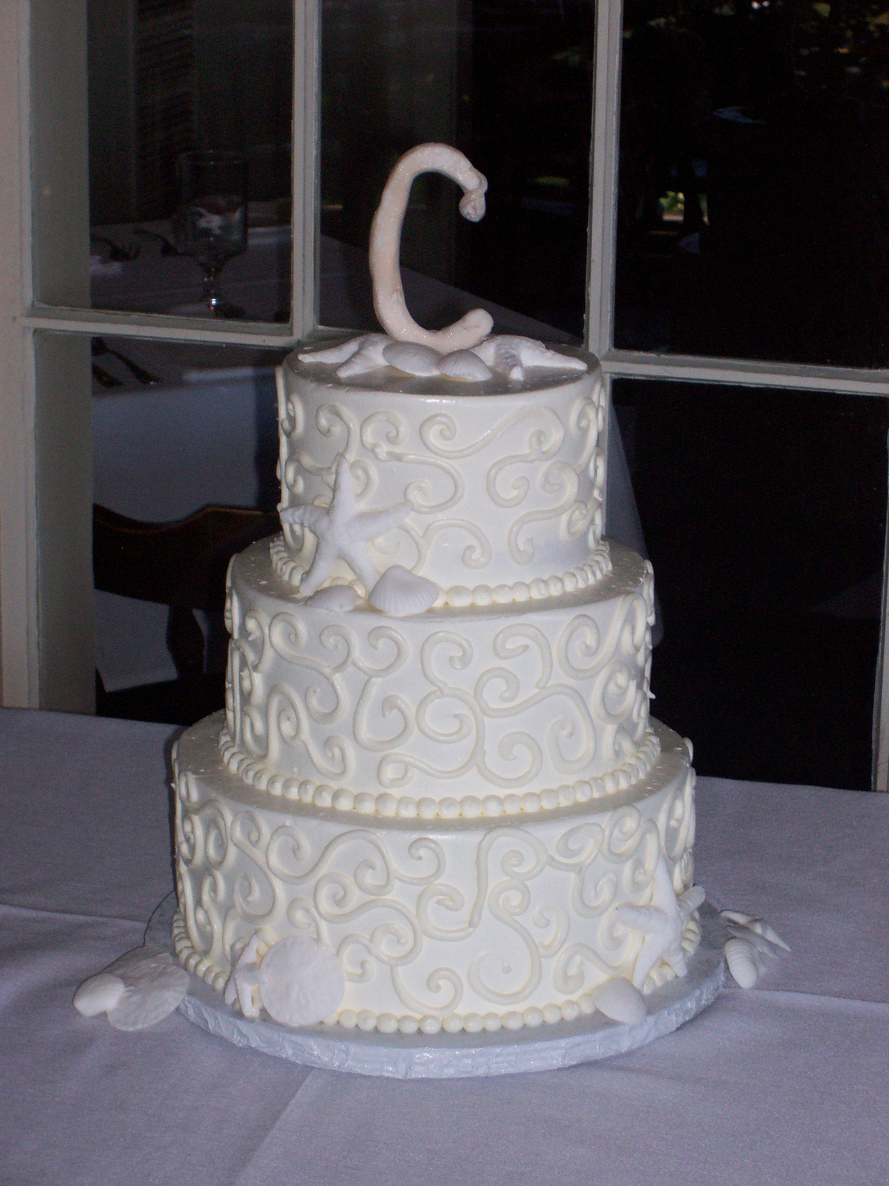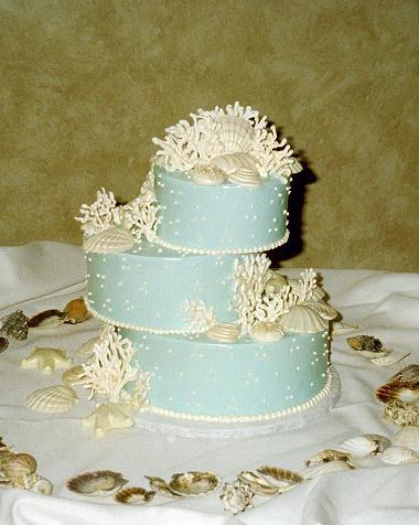 Tiers are stacked askew, finished with swiss dot piping and finished with clusters of edible seashells